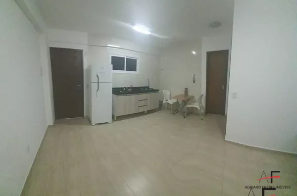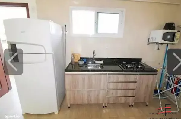 Apartamento no porcelanato com móveis projetados, 1 suíte reversível (com cama), sala, varanda com vista mar, cozinha, área de serviço e 1 vaga de garagem.