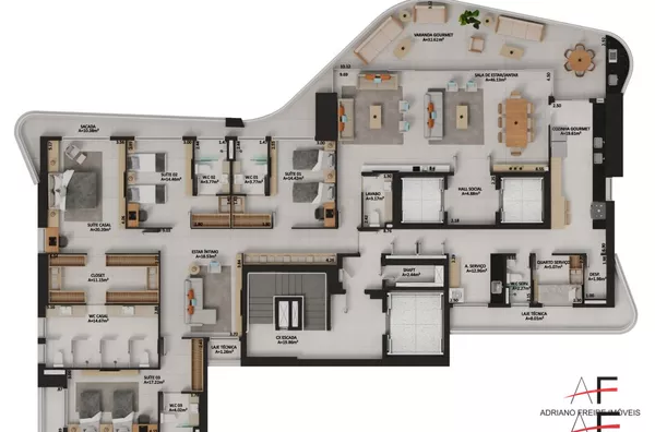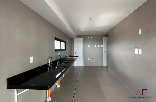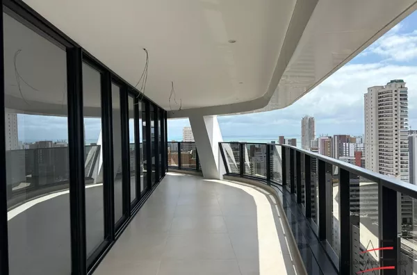 Apartamento todo avarandado com 4 suítes (sendo 1 master com 2 closets e 2 banheiros), sala para 3 ambientes, varanda gourmet ampla com bancada gourmet e espaço para jacuzzi, lavabo, cozinha ampla com copa, dependência completa de serviço, despensa e área para louças, hall social privativo, hall de serviço privativo e 5 vagas de garagem.
