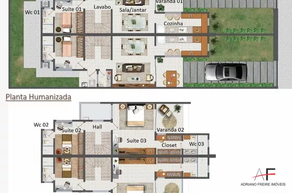Casa Duplex com 114m², 3 suítes (1 com closet e varanda), sala ampla para 2 ambientes, cozinha, área de serviço, lavabo, hall e 2 vagas de garagem.