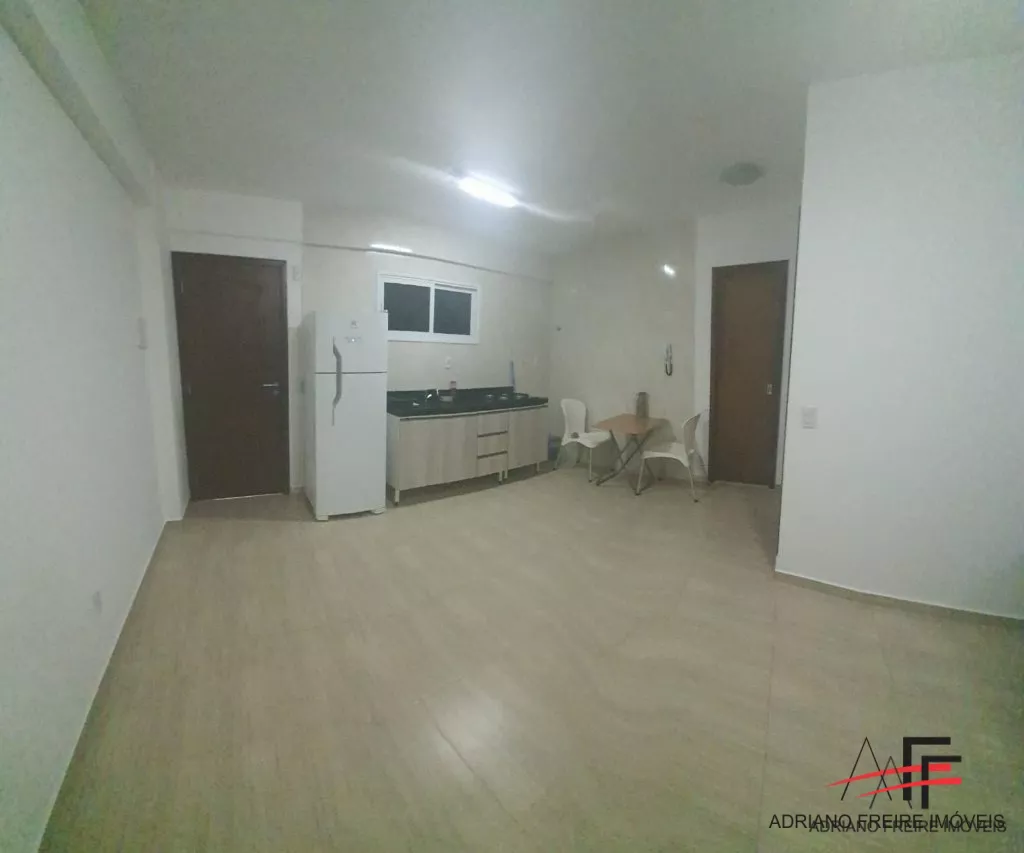 Apartamento no porcelanato com móveis projetados, 1 suíte reversível (com cama), sala, varanda com vista mar, cozinha, área de serviço e 1 vaga de garagem.