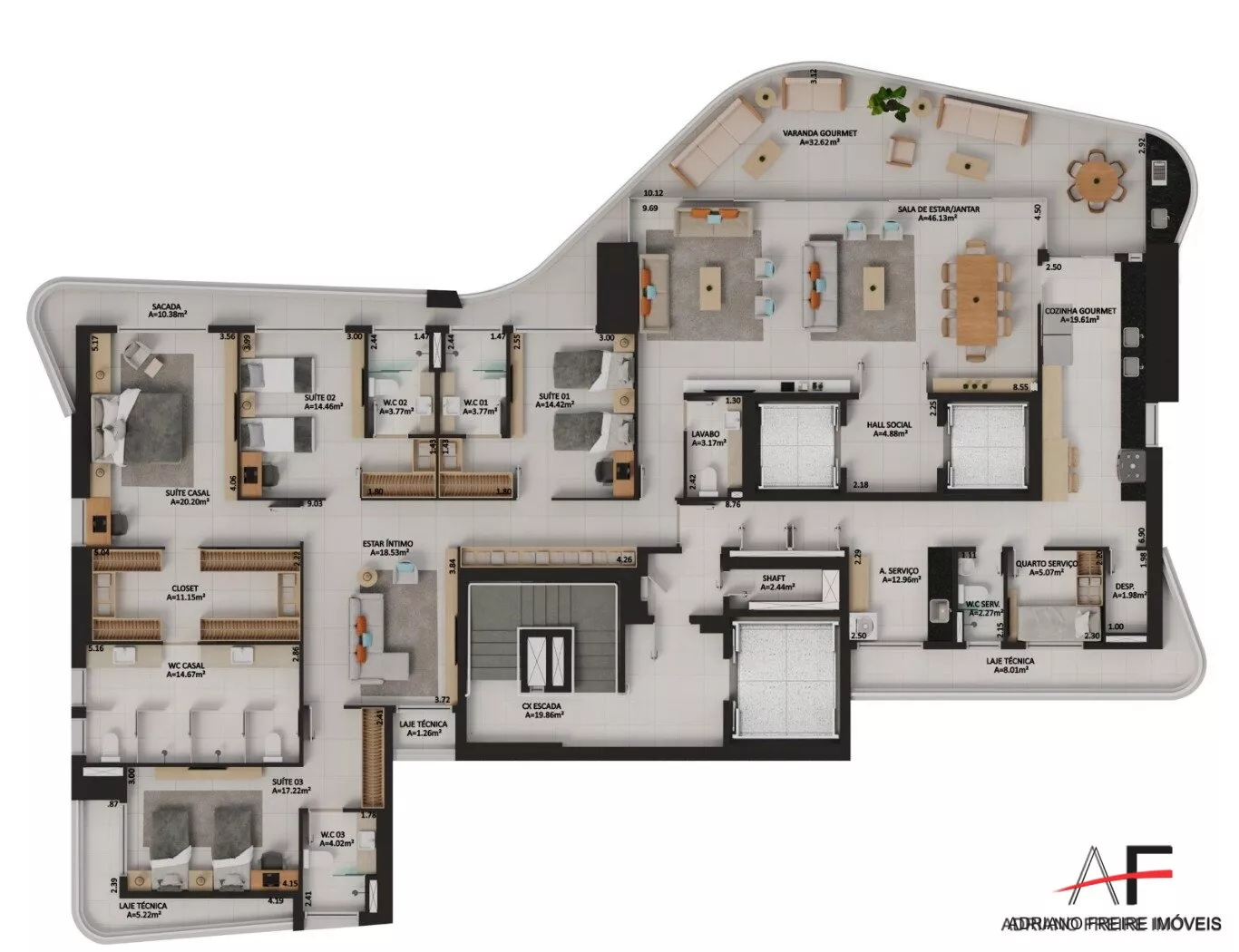 Apartamento todo avarandado com 4 suítes (sendo 1 master com 2 closets e 2 banheiros), sala para 3 ambientes, varanda gourmet ampla com bancada gourmet e espaço para jacuzzi, lavabo, cozinha ampla com copa, dependência completa de serviço, despensa e área para louças, hall social privativo, hall de serviço privativo e 5 vagas de garagem.