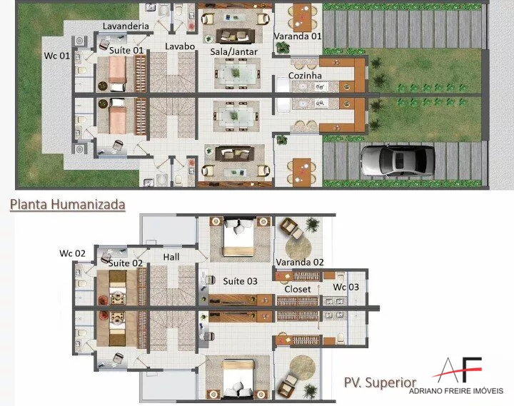 Casa Duplex com 114m², 3 suítes (1 com closet e varanda), sala ampla para 2 ambientes, cozinha, área de serviço, lavabo, hall e 2 vagas de garagem.